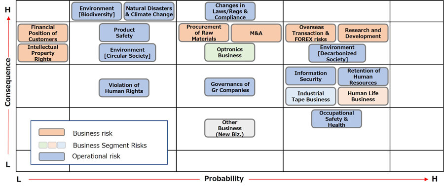 Risks and opportunities related to the environment, including nature, are managed comprehensively across the group by integrating them with other key risks that have a significant impact on business activities. We conduct a two-axis analysis with the “degree of impact” on the business if a risk actually occurs or becomes apparent on the vertical axis, and the likelihood of occurrence” on the horizontal axis, thereby evaluating each risk in relative terms and recognizing the importance of nature-related risks among company-wide risks. In addition, these company-wide risks are broadly classified into “business risks” related to business operations and “operational risks” that impact the entire group, and appropriate risk management is conducted for the entire group. The main risks for the entire group in fiscal year 2024 are as follows. For more details, please refer to the link below.