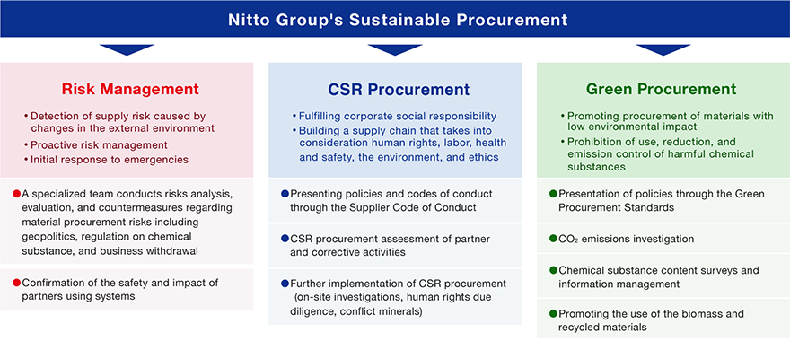 Nitto Group está comprometido con las actividades de abastecimiento sostenibles a través de iniciativas como la “gestión de riesgos”, la “contratación de RSC” y el “abastecimiento ecológico”. Estas actividades están en consonancia con la política de Nitto Group de situar los factores ESG en el centro de su gestión y se implementan a través del programa ESG para proveedores. El objetivo de estas actividades de abastecimiento es identificar y mitigar los riesgos asociados a las interrupciones de la cadena de suministro, las violaciones de los derechos humanos y los problemas medioambientales, como la reducción de las emisiones de CO2, en respuesta a los cambios de las condiciones del mercado.
