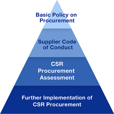 Nitto Group identifica primero claramente a los proveedores clave para implementar evaluaciones de la RSC. En concreto, además de los socios con los mayores volúmenes de transacciones, definimos a los proveedores clave como aquellos cuyas transacciones se consideran muy importantes, aquellos cuyo impacto ambiental (como las emisiones de CO2) sería significativo y aquellos sobre los que existen posibles problemas por sus consecuencias negativas en cuanto a los derechos humanos. Estos proveedores clave tienen prioridad para las evaluaciones de la RSC. Además, estamos ampliando nuestros esfuerzos para construir una cadena de suministro sostenible.