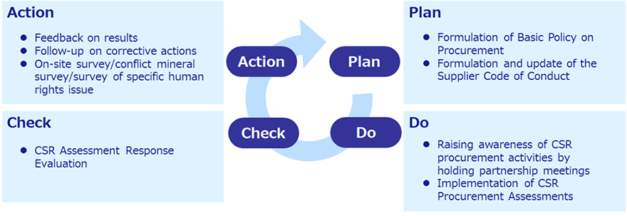 O Nitto Group realiza um questionário anual de aquisição de CSR para melhorar a transparência e a melhoria das atividades de CSR de nossas empresas parceiras. Esta pesquisa é baseada no código de conduta da RBA e consiste em elementos-chave, como "Direitos Humanos e Trabalho", "Saúde e Segurança", "Meio Ambiente", "Comércio Justo", "Segurança da Informação" e "Penetração da CSR na cadeia de suprimentos". Solicitamos informações detalhadas de nossos parceiros sobre esses itens e, com base nos resultados, compartilhamos planos de ação específicos que visam melhorar a sustentabilidade. Além disso, desde o ano fiscal de 2023, recorremos à EcoVadis para avaliar de forma abrangente as atividades de CSR, quantificar os resultados e acompanhar o progresso, com o objetivo de construir uma cadeia de suprimentos sustentável.