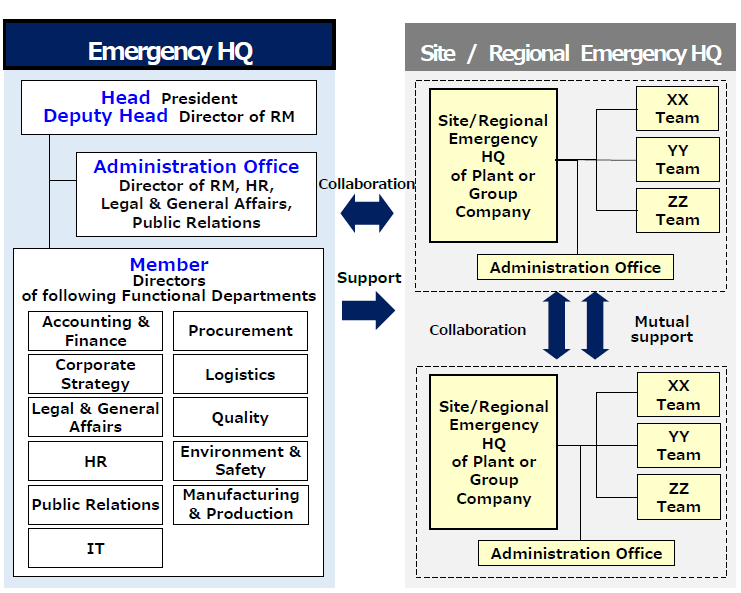 Sollte es zu einer schweren Katastrophe oder einem ernsthaften Unfall kommen, wird die Geschäftsführung durch ein von der Nitto Group entwickeltes System sofort informiert. Darüber werden die Mitarbeiter im Emergency & Incident Reporting Guidebook informiert. Wenn der Präsident von Nitto entscheidet, dass dies notwendig ist, wird sofort ein Notfallhauptquartier eingerichtet. Während Informationen zum Schadensstand und den Auswirkungen des Ereignisses gesammelt und analysiert werden, erhalten alle betroffenen Konzernunternehmen und Standorte Unterstützung von der gesamten Nitto-Gruppe.
