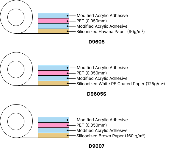 D9605S: Siliconized white PE coated paper (125g/m²) D9607: Siliconized brown paper (160 g/m²) |