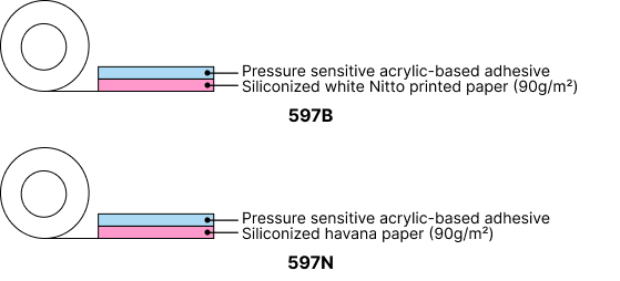 597B: Siliconized white Nitto printed paper (90g/m²) 597N: Siliconized havana paper (90g/m²) |