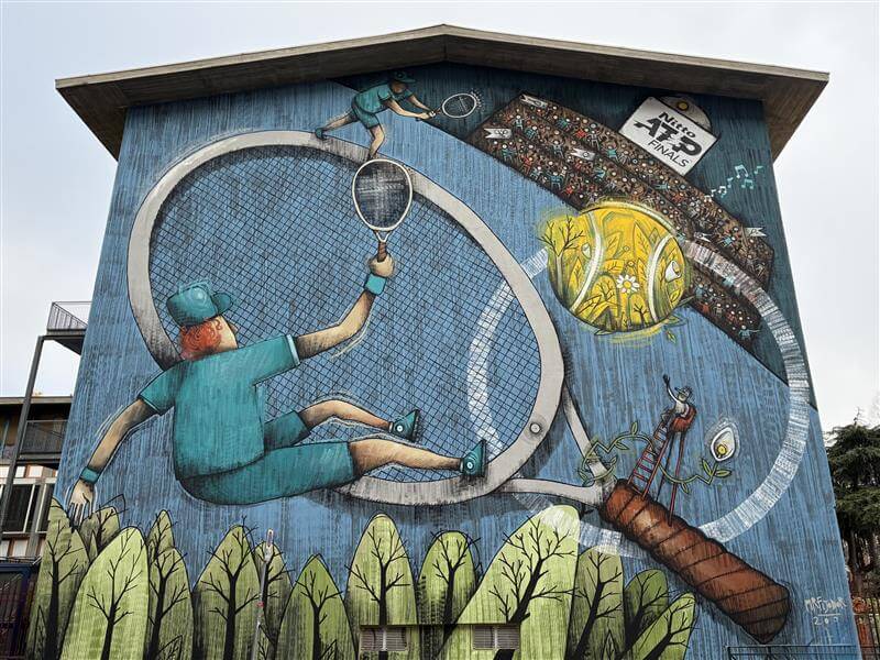 さらに、今年は新たな取り組みとして、大気中のCO2吸収を促進する塗料を使用した「Green Art Wall」を制作。地元のアーティストと小児がん患者支援団体「U.G.I. ODV」の子どもたちとのコラボレーションで作品を作りあげた。この「Green Art Wall」は、トリノ市の空気浄化に貢献しながら、Nitto ATP Finals がトリノの街へ贈るサステナビリティのシンボルとして、今後も街に残り続けていく。