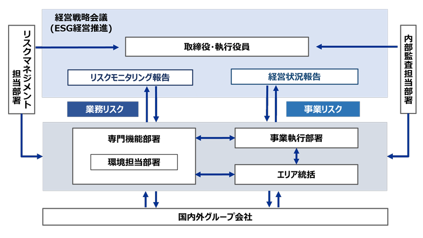 自然を含む環境に関するリスク・機会は、事業執行部署、エリア統括が連携してモニタリングを行うとともに、その管理責任を環境担当部署が負います。モニタリングしたリスク・機会に関する情報は、その他専門機能部署で管理されている情報とともに取締役、執行役員によって構成される経営戦略会議にて毎月報告・審議されます。審議結果は直ちに関係部署に展開され、リスク・機会への対策を速やかに実行し、統制の強化を図ります。実行内容や改善状況は再び経営戦略会議において報告・確認し、グループのマネジメントの実効性を高めています。