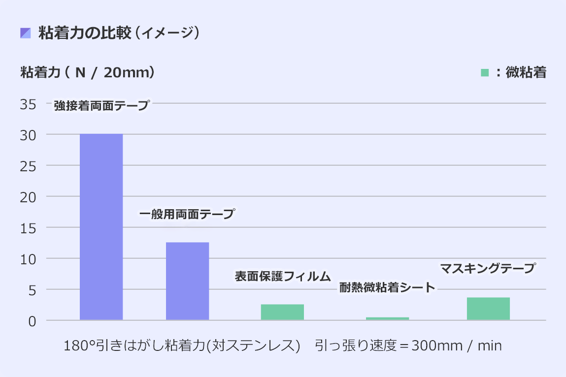 これらのテープは、貼り合わせた状態では機能を完遂する粘着力を保ち、はがすときに、簡単に少ない力ではがすことが可能です。