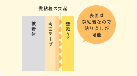 粘着剤の表面に特殊樹脂で形成した凸構造を持ち、表面は微粘着でベースは強粘着のため位置調整(スライド)機能と接着特性を両立することが出来ます。貼りたい場所に強く押しつけるまで何度でも貼り直しすることが可能です。