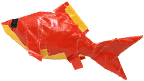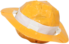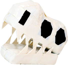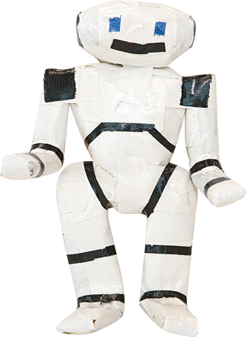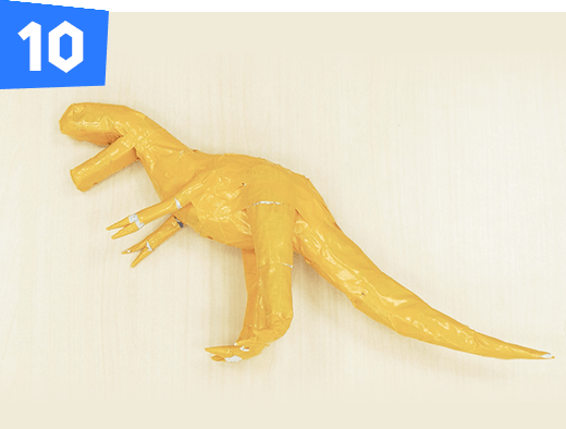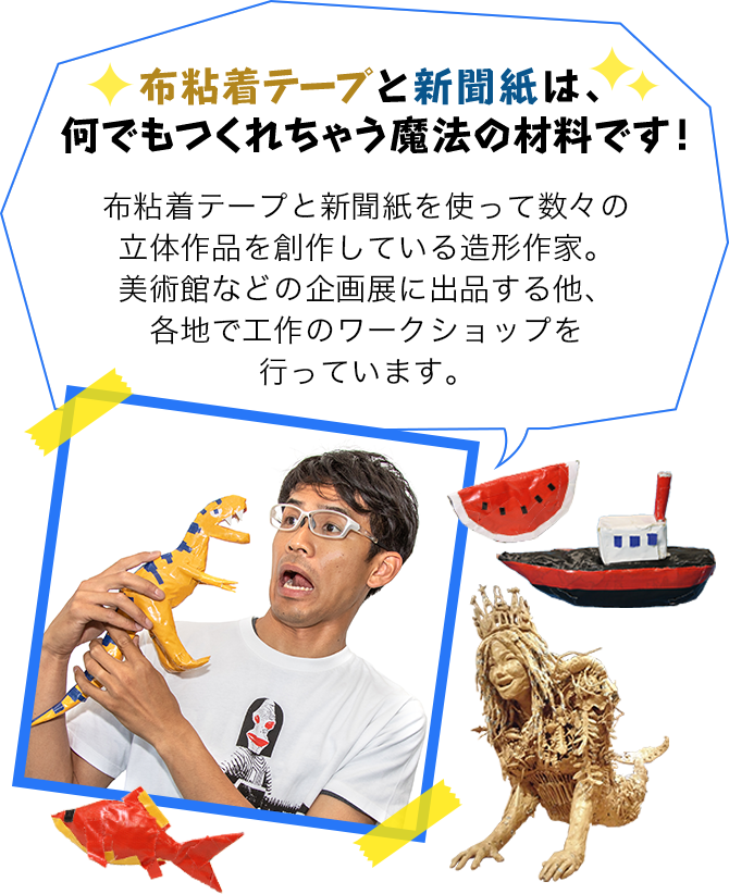 布粘着テープと新聞紙を使って数々の立体作品を創作している