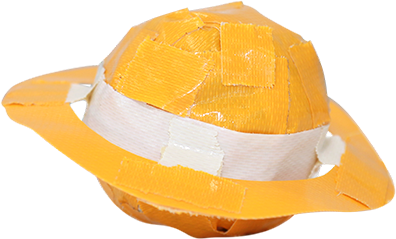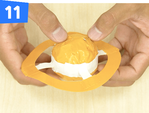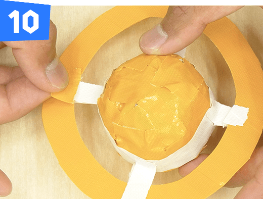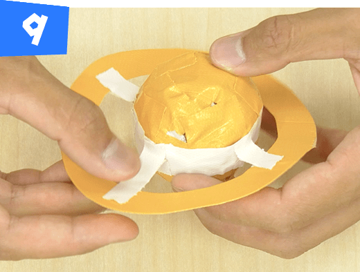 球体とリングを細くさいた白いテープで4カ所とめて合体させます。
