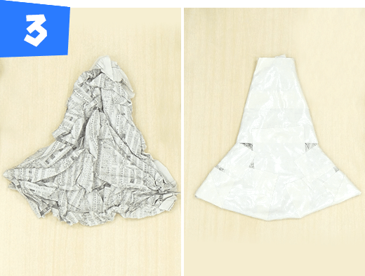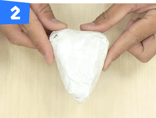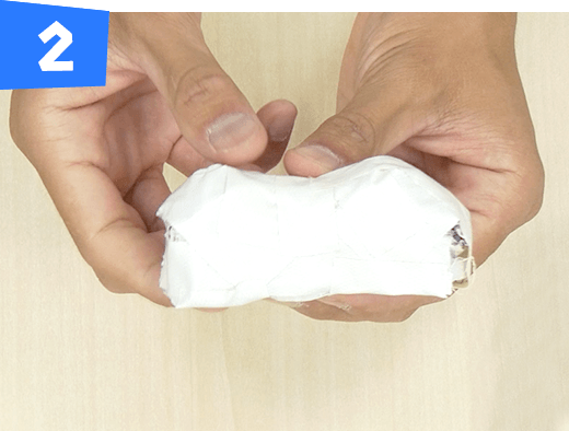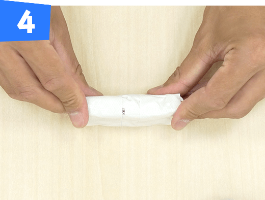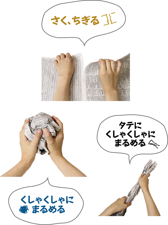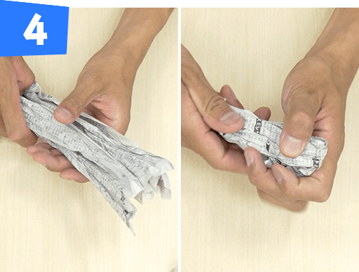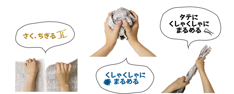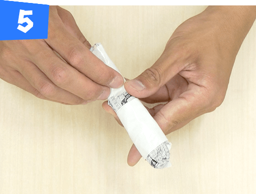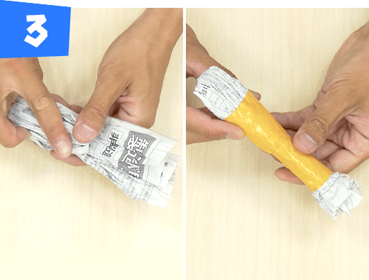 新聞紙1/2 枚をタテにくしゃくしゃにして半分に折り、さらに1/3 のところで折り、中央部分をテープで巻きます。
