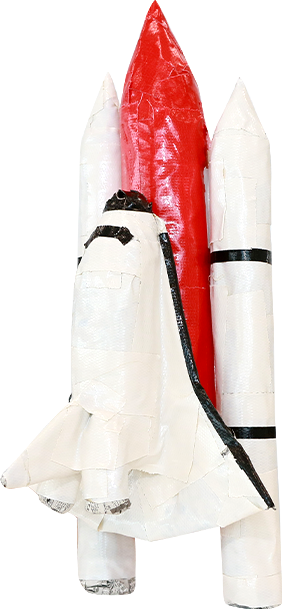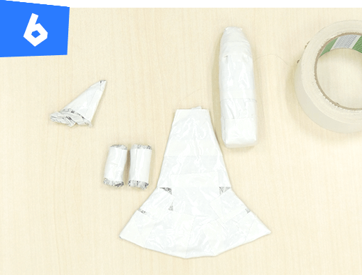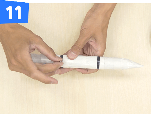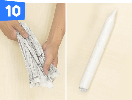 新聞紙1枚をタテにくしゃくしゃにして半分に折ります。片方の先をとがらせ て全体を白のテープで巻いてロケットブースターを作ります。