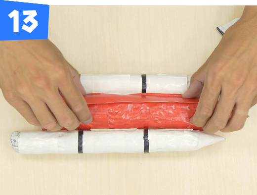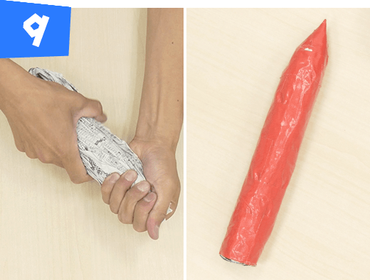 新聞紙2枚をタテにくしゃくしゃにして半分に折ります。片方の先をとがらせて全体を赤のテープで巻いて燃料タンクを作ります。