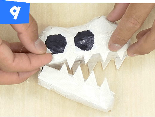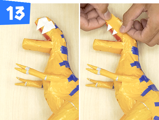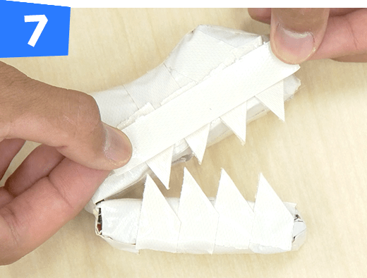 白のテープを1×2cm にちぎり三角形に折って歯をつけます。白の三角形以外の部分を黄色のテープで覆います。