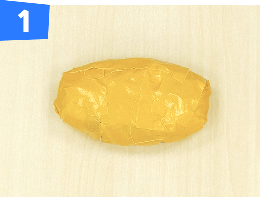 新聞紙1枚をくしゃくしゃに丸めて黄色のテープで全体を巻いて胴体を作ります。