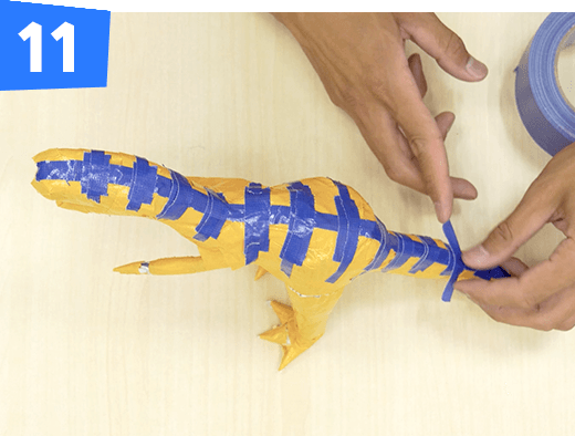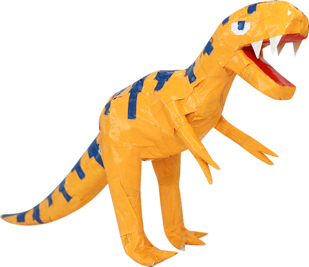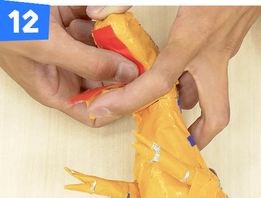 新聞紙で形を作ったら、布粘着テープを巻いて形を固定します。さらにその上に色付きの布粘着テープを貼って色や模様をつけていきます。作品づくりには、布でできた布粘着テープが立体を作りやすく適しています。細かい部分や模様は細くちぎった方がやりやすいです。