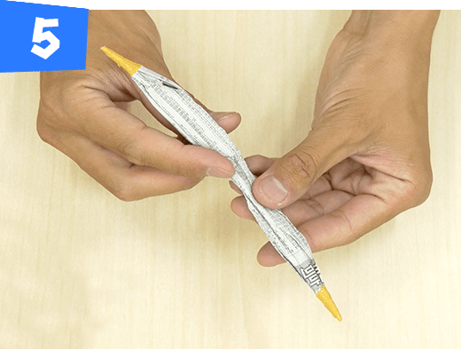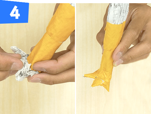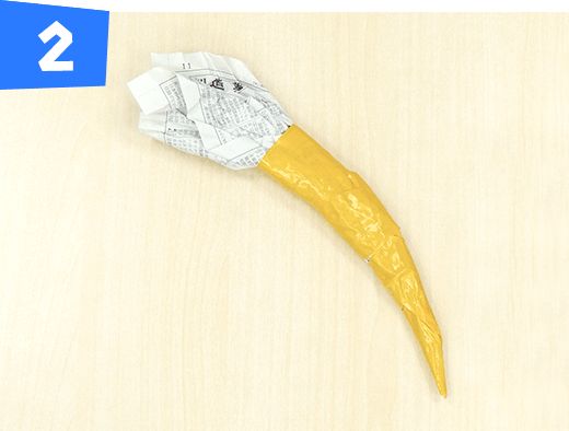 新聞紙1/2枚の真ん中をつまんで先をとがらせてくしゃくしゃにしてしっぽを作り、黄色のテープを巻きます。