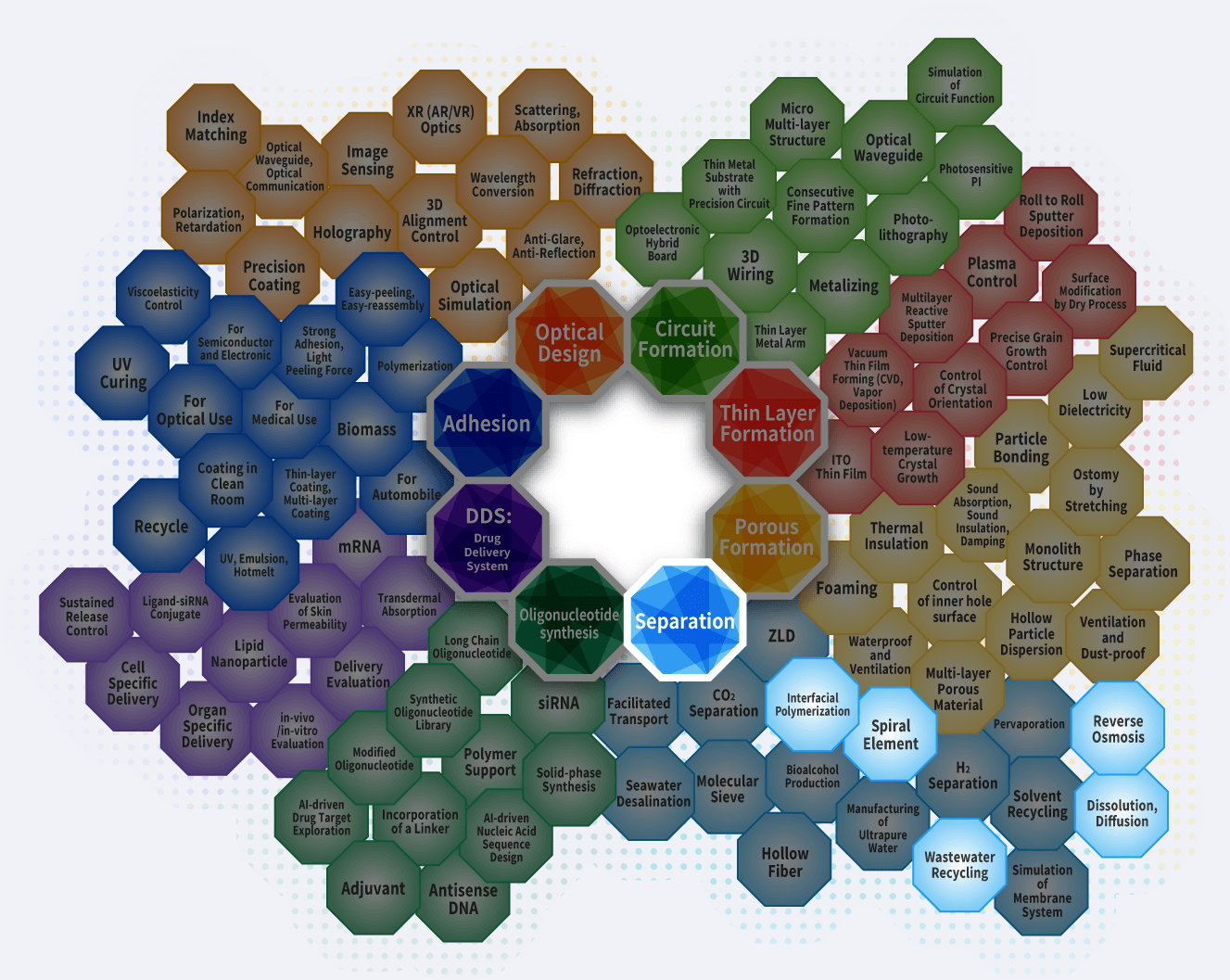 At Nitto Group, based on 8 core technologies, dozens of peripheral technologies have been researched and developed. These technologies have been combined to create a “composite of technologies”,